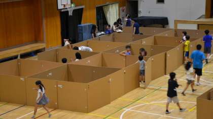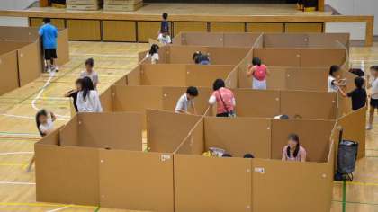夜9時、そろそろ就寝の時刻です。段ボールのパーティションで、ある程度のプライバシーは守られます。大地震が起こって、体育館に泊まる事態になったときは、おそらくこのような準備が出来る状況では無いと思いますが、ある程度日がたった段階でこのような避難所生活になることを想定して行っています。夜9時半、消灯です。おやすみなさい。