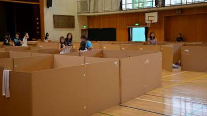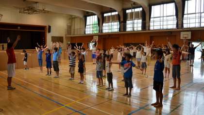 19日朝は6時起床。なれない体育館での宿泊で、ちょっとだるそうです。幸い昨夜は涼しかったのが幸いです。6時半から体操をしました。本校副校長の指導で、はじめにラジオ体操第1、次にエアロビクス風のダンスをして、大人も子どもも目がしゃっきりしました。