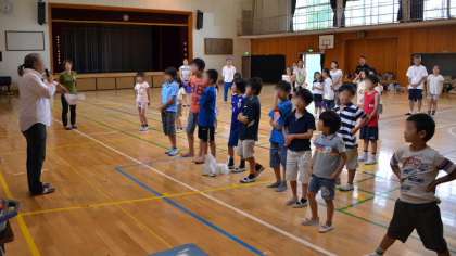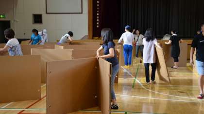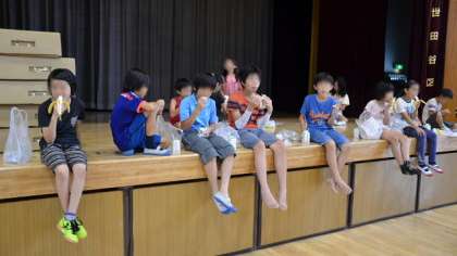 朝食は備蓄食料のビスケット、そして特別に用意した牛乳とバナナが配られ、みんなで食べました。食事の後、参加者全員が協力して段ボールのパーティションを片付け、閉会式を行い、8時に全ての訓練を終了しました。運営に当たって下さった地域の皆さんとPTAの皆さん、ありがとうございました。