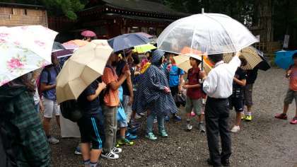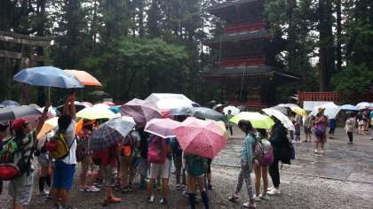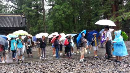 東照宮の見学をしているようすです。雨が本格的に降り始めました。