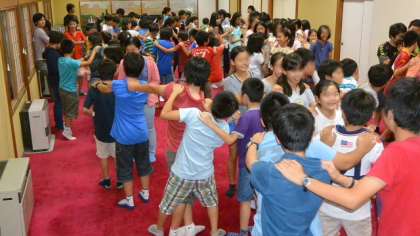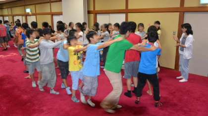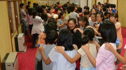 続いてのプログラムは「じゃんけん列車」です。音楽に合わせ歩き回り、音楽が止まった時そばにいた人とじゃんけんをして、負けた方が後ろにくっつくという単純なゲームですが、けっこう盛り上がりました。