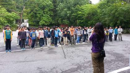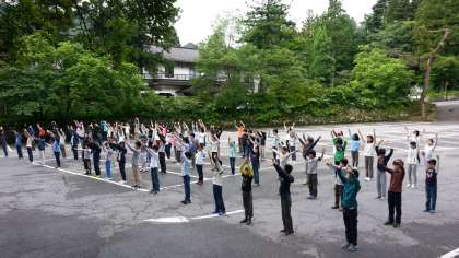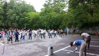 朝会は宿の近くの駐車場で行います。行動班ごとに整列して話を聞き、その後ラジオ体操体操をしました。ちょっと眠そうですが、病人もなくみんな元気です。
