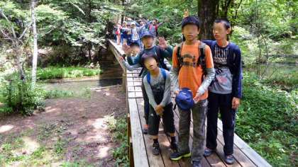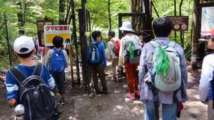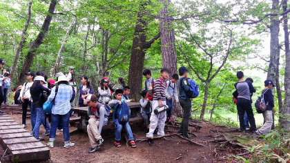 湯滝から、戦場ヶ原のハイキングコースの入り口には、鹿よけフェンスをついていました。そこには熊に注意の看板も・・・ちょっと緊張します。予定より遅れているため、ペースをあげて歩きました。子どもたちはしっかりついてきて、立派でした。