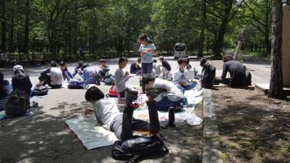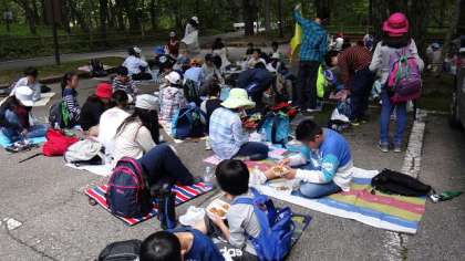 12時30分頃、予定より15分ほど遅れて昼食をとる石楠花橋に到着。お弁当とミネラルウォーターを配布して少し遅い昼食となりました。今朝食べたのが早かったので、たどり着く前から「おなかがすいた」の声があがっていましたから、みんなおいしくいただきました。