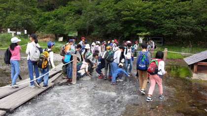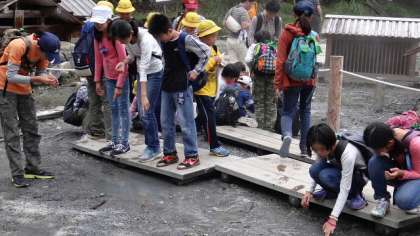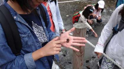 観察園の見学を終えて、ほぼ予定通りのスケジュールに戻り、バスで再び奥湯本へ戻り、奥湯本の源泉を見学しました。班で一つ10円玉を、温泉がわき出しているところの近くに置くと、10円玉が硫化水素の影響で真っ黒に変色しました。