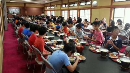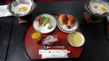 朝食です。東観荘でいただく最後の食事です。パンと目玉焼きなど洋食メニューです。しっかり食べています。