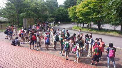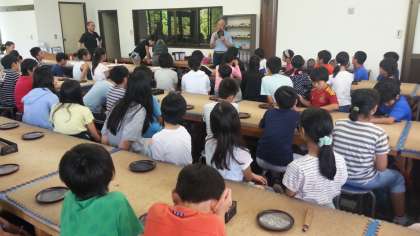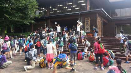 バスで数分の木彫りの里工芸館に移動して、日光彫り体験をします。自分で選んだ図案別に別れて入館。お世話になる工芸館の方から説明を聞きます。