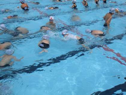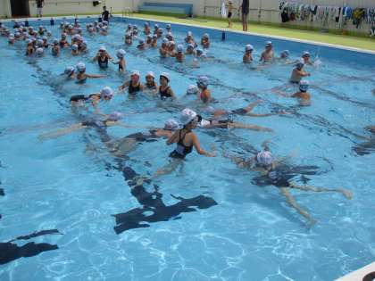 水慣れの後は,浮く・もぐる遊びを楽しみました。大の字になって力を抜いて浮いたり,バディで水中じゃんけんをしたりしました。低学年の内に十分,水に慣れ親しんでおきたいものです。
