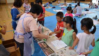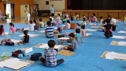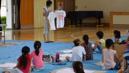 23日(水)午後は、サマースクール2日目。今日は「Tシャツに絵を描こう」ということで、ブルーシートをしいた体育館で、集まった子どもたちが白地のTシャツに思い思いの絵を描きました。今日も地域の皆さんが、会場準備や絵の描き方の説明、絵の具の準備などお世話をしてくださいました。