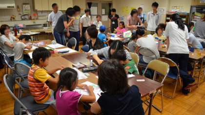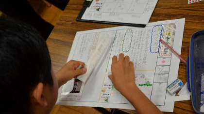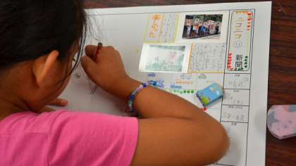 学校に戻り、今日の結果などをもとに新聞作りをしました。データをもとに、表にシールを貼ったり、今日のようすを撮った写真をプリントアウトしてもらい、新聞に貼り付けたりしました。