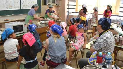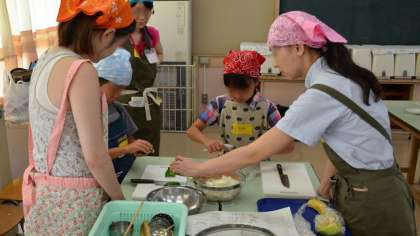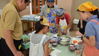 今日作るのは、「ぶたミンどん」「ズッキーニのベーコンチーズやき」「フルーツしらたま」の3品です。最初に栄養士さんに作り方の見本を見せていただきました。さあ、親子で作る料理の開始です。スタッフや家族の手助けで、小さな子どもたちもがんばっています。はじめて包丁を使う子もいて、はじめのうちはおっかなびっくりでしたが、手助けしてもらいながらやっているうちに、楽しくなってきます。