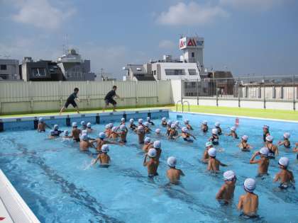 水慣れは,音楽のリズムに合わせてのアクアビクスダンスで始まりました。
