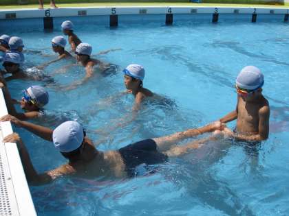少し難しかったようですが,お互いに手を引いて泳ぎました。