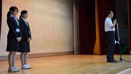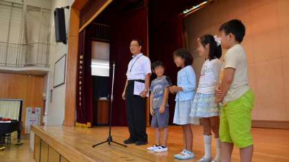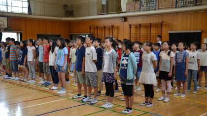 始業式のようす。上の写真は5・6年生が校歌を歌っているところです。姿勢よく、一生懸命歌っています。高学年が落ち着いていると、よいお手本となりやはり学校全体が締まります。うれしいことです。続いて、今日から始まった栄養士の教育実習生の紹介をしました。大学生2名が学校の教育活動や給食、食育について学びます。そして、昨日の「アドベンチャーin多摩川」に参加した3年生4名を紹介し、感想を述べてもらい、記録証を渡しました。来年に向けてよい励みになりました。