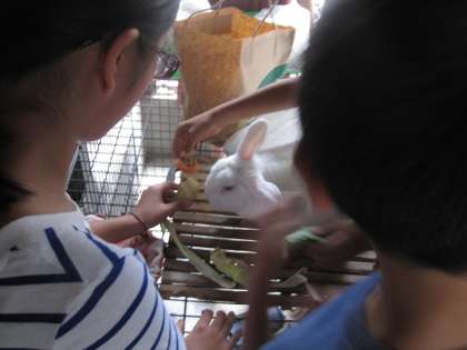 地域の方が「ウサギは,トウモロコシの皮が大好きだからね」と言って