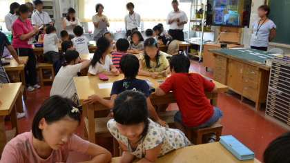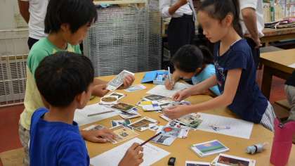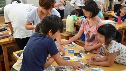 3日(水)5校時、5年1組で図工の研究授業を行いました。本校では、今年度「論理的に表現する児童の育成〜一人ひとりの子どもに自らの問いをもたせる問題解決学習の工夫〜」をテーマに、算数の研究を進めているところです。今日は、その研究が他の教科にも生かされるのではないかという仮説で、図工の作品鑑賞の学習にチャレンジしました。何十種類もの美術作品のカードを使って、「夏」や「悲しい」などの「お題」をもらって、美術作品を3、4人でのグループで話し合って仲間分けします。そのときに、自分がなぜその「お題」にふさわしいと考えたかをグループで述べ合います。