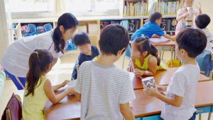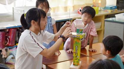 高校生が授業を手伝っている様子です。上と中の写真は、1年生の造形活動のお手伝いをしているところです。子どもたちは、やさしく声をかけてもらってうれしそうです。校舎前の学級園を耕す作業もしてもらいました。みんな素直でよく働く高校生です。これからあと4回、各クラスで授業補助などをしますので、よろしくお願いします。