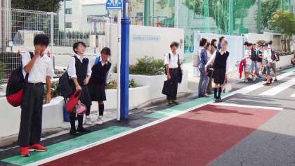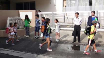 9日、「多摩川の学び舎合同あいさつ運動」の2日目です。昨日から降り続いていた雨がやみ、朝日が降り注ぐ気持ちのよい朝となりました。東門には通勤途中の保護者の方が立ってくださり、西門には昨日より多数の瀬田中学校の生徒が参加してくれました。もちろん本校児童もあいさつ当番として元気にあいさつしました。