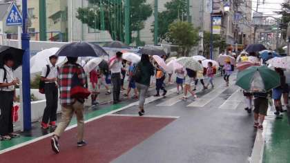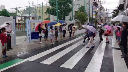瀬田中学校、瀬田小学校と合同して行っているあいさつ運動。11日(木)今朝は4日目。朝から雨の天気にもかかわらず、こんなにたくさんの地域・保護者の皆さんと瀬田中学校の生徒、そして本校児童が参加しました。傘をさして登校してくる児童、そして通りかかる地域の人たちに元気よく「おはようごあいます」のあいさつしました。
