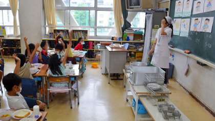 先週から区内大学の学生が2名、栄養士としての教育実習をしていますが、いよいよ11日(木)今日と明日で終了です。今日は大学の先生もが様子を見にいらっしゃって、実習生もちょっと緊張気味。給食の5分間指導は1年生2クラスで行いましたが、子どもたちの意見を聞いたり、ようすに合わせて話をしたり、進歩していました。
