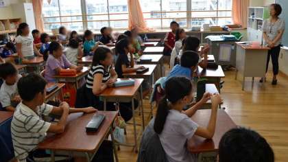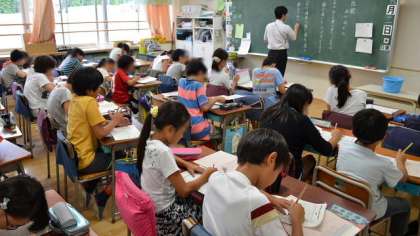 5年は和歌です。四首の和歌を音読して、簡単に意味を解説しました。その後、四首から自分の気に入った一首を選び、ワークシートに書き写したり、意味について自分なりの解釈を膨らませて、解説をつける学習をして、グループのこと比べて楽しんでいました。