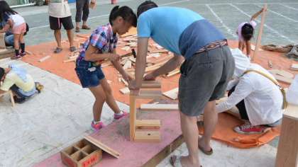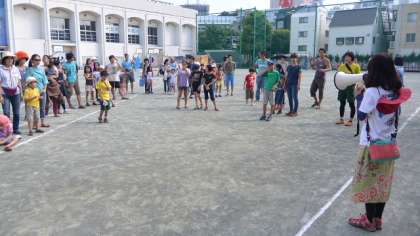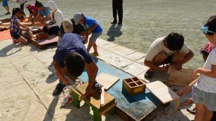 14日(日)午後、家庭教育学級が校庭で開催されました。今日は「プレーカーがやってきた」です。「プレーカー」というのは、世田谷区内4ヶ所の公園などで行われている「プレーパーク」の出前です。プレーパーク事業は、世田谷区の国際児童年記念事業として始まり、開設当初から区と住民との協働による事業として実施しているものです。常駐のプレーリーダーや地域のボランティアの方たちのもとで、普通の公園ではなかなかすることができない焚き火や泥遊び、木登りなどをすることができます。この事業の運営については、「NPO法人プレーパークせたがや」に委託して実施しています。そのプレーパークが校庭にやってきたのですから、子どもたちは大喜びです。開会式を行い、さっそく遊び始めました。写真は木工作を楽しむ子どもたちと引率の保護者の方々です。