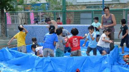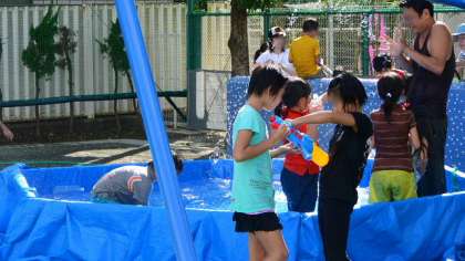 校庭の造形砂場の所には、簡易プールができあがり、水かけ遊びや水風船、水鉄砲で大はしゃぎです。