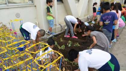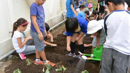 職員室の前に子どもたちが植えた植物。しっかり育つとよいですね。種や苗に気持ちを込めて最後に水やりをしました。今日から本校で職業体験の学習に入っている中学生も、手伝ってくれました。