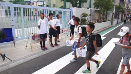 18日、瀬田中学校の生徒4名の職場体験2日目です。朝から正門に立って、登校してくる子供たちにあいさつをしました。職場体験は明日が最終日です。