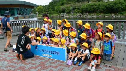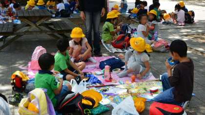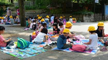 水族館見学が終了。出口のところでクラスごとに記念撮影。近くの品川公園に移動してお昼ご飯の時間にしました。家から持ってきたおいしそうなお弁当を、とてもうれしそうに食べる子どもたちです。