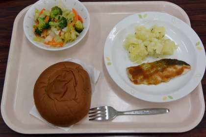 ココアパン 牛乳 魚のバーベキューソース パセリポテト イタリアンサラダ