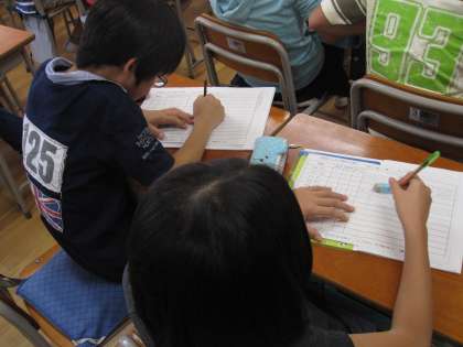 「お札にしたいあの人物」のまとめの授業です。子どもたちが考えたお札の肖像画にふさわしい人の条件は,人々のために働いた人・平等を願う人・平和な世の中をつくった人・国のために活躍した人・地震の復きゅうでがんばった人でした。一人ひとりの強い思いで人物を選び,理由を明らかにして発表原稿をつくりました。友達の発表を聞いて,お互いに相互評価していきます。話し方(声の大きさ,目線,速さ),発表内容などについて熱心にメモを取りながら聞いていました。