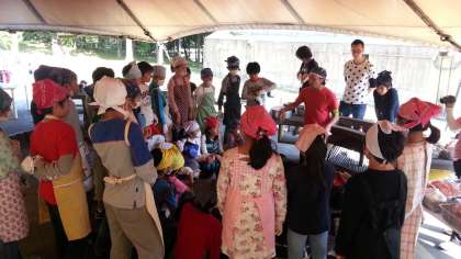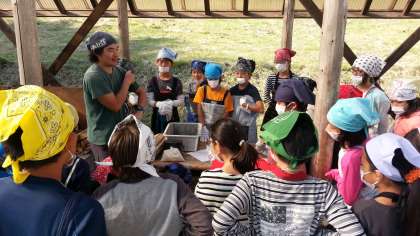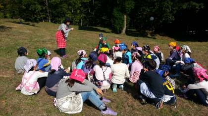 2時、いよいよ夕食のカレーライス作り、飯ごうすいさんです。最初に、カレー、飯ごう、かまどの係にわかれて、説明をしてもらいました。