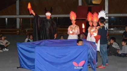 今日のキャンプファイヤーは、外の気温の関係などがあり、室内で行うことにしました。武尊山の火の神様が、火の子を従えてやってきました。神様から与えられた友情、絆、努力、勇気の火を一つにして中心の一つの灯りにしました。