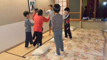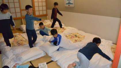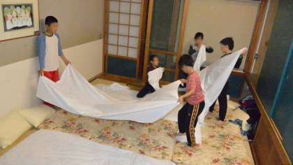 これで今日のスケジュールはすべて終了。大きなけがや急病人もなく、みんな元気です。就寝準備をしてあとは寝るだけです。シーツと枕カバーをかけ、部屋に丁寧に布団をしく子どもたちです。