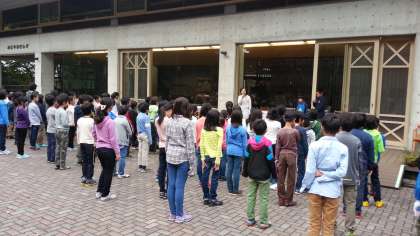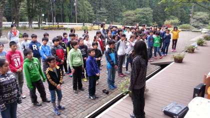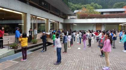 6時30分朝会。ラジオ体操をして目を覚まします。ちょっと眠そうな子もいます。
