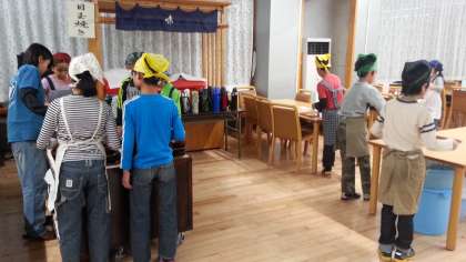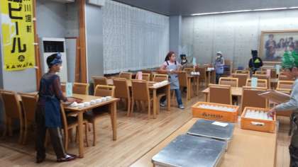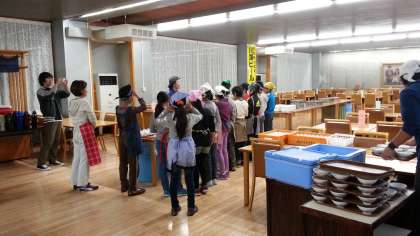 朝会の後、食事係が一足早く朝食準備です。