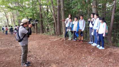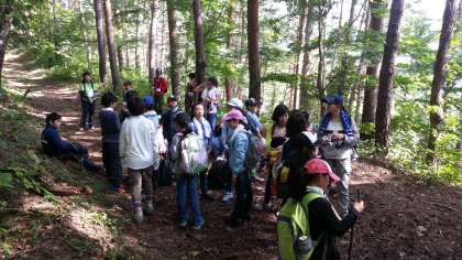 1時間あまり登って、目的の場所に到着。休憩をしました。頂上近くの木の幹には、熊の爪痕が!その前でグループごとに記念撮影をしました。