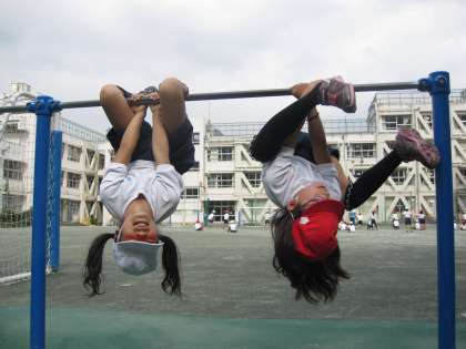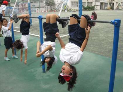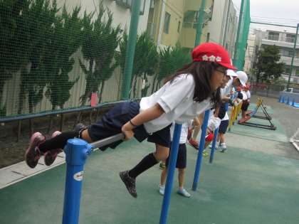 『鉄棒を使った運動遊び』をしています。上手な子がみんなに言っています。「ぼくは毎日休み時間に練習したんだよ!」みんなは納得して,友達の演技を見ていました。【地球まわり】では,友達と声をかけ合いながら楽しそうに取り組んでいました。【こうもりふり】では,はじめは体に力が入って怖がっていましたが,「力をぬいて,リラックスしてごらん」と声をかけると,すぐにできるようになりました。【つばめ】では,前をしっかりと向いて,ひざと足首を伸ばし,ピタッととまります。みんなよくできました。