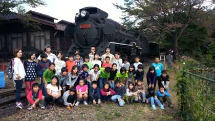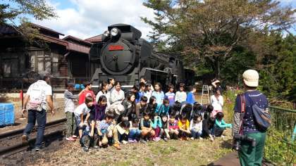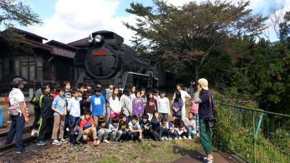 体験乗車したSLの前でクラスごとに記念撮影をしました。