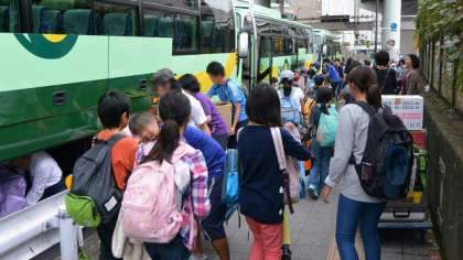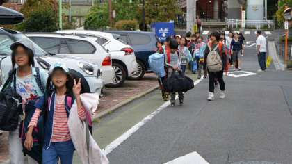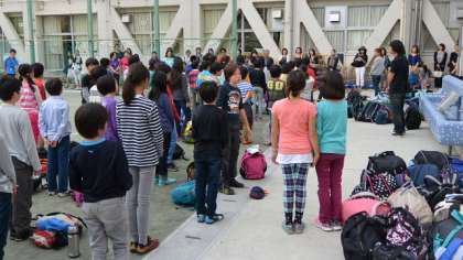3時45分、バスは学校の近くの246号線に着きました。たくさんの学校職員と家族のお出迎えに、子どもたちも感激です。バスから荷物を降ろして学校まで運びます。校庭に整列して、出迎えてくださったみなさんに帰校のあいさつをしました。