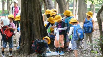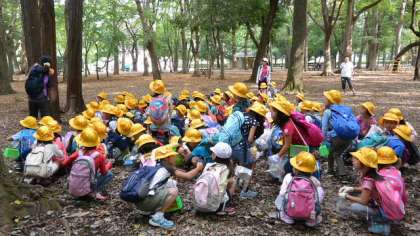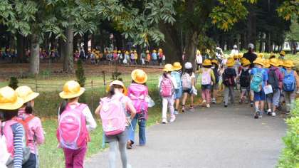11日(土)1・2・3時間目、1年生が砧公園に出かけて生活科の校外学習をしました。テーマは「秋をさがそう」です。学校から徒歩で30分あまり、坂を登って、長い道のりを歩いてがんばって砧公園にたどり着きました。担任の先生から注意を聞いて、さっそく秋探しです。