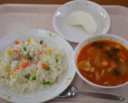 三色ピラフ 牛乳 ミネストラスープ 梨