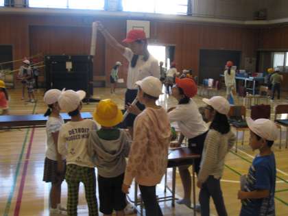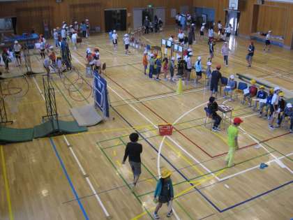 スローガンは,「エコで楽しいキッズフェスタ!」です。体育館では,様々な工夫された場で運動を楽しむことができます。5年生「炎の体育会スポチャ」6年生「スポーツタウン」2つのお店が,空間を上手に活用していました。