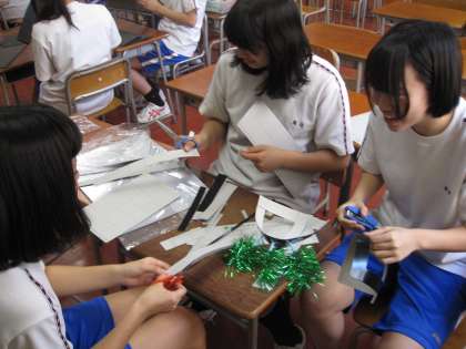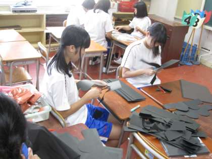 1年生の教室では,学芸会に子どもたちが身につけるものを作成していました。ヘッドギア,帽子,タガメ,ザリガニ,おたまじゃくしなどを一生懸命作ってくれていました。