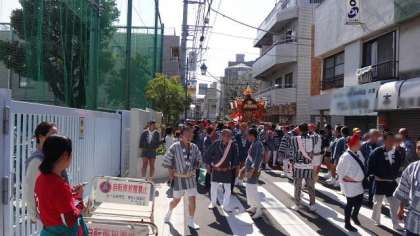 子どもたちの御輿の後は、大きなおとなの御輿が威勢のよいかけ声で学校前を練り歩きます。さすがに大人の御神輿は迫力があり、沿道で見守るみなさんも大喜びです。急激にモダンな街に変貌している中で、歴史と伝統も大事にしている二子玉川の街は、とてもすてきですね。