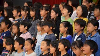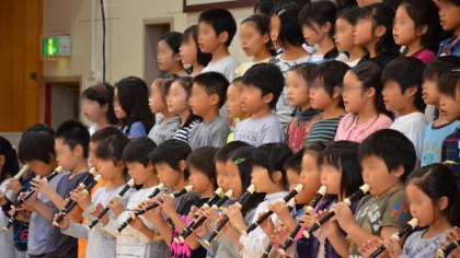 3年生は、最初のうち少し緊張した表情でしたが、やがて真剣に取り組み、みんなで奏でる音を聞き合いながら見事な演奏を披露してくれました。歌も3年生らしい元気さと一生懸命さで、リコーダーとのアンサンブルや、パートを分けて歌ったりと、とても見事な歌唱を聴かせてくれました。指導と伴奏は、3年生担当の音楽講師です。