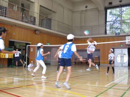 「ソフトバレーボール」を学習しています。どの子も楽しめるように,ルールを工夫しています。キャッチからのトスで積極的にアッタックができます。ゲームとゲームの間には,チームの仲間と頭を寄せ合い,作戦を立てたり,よかったプレーを紹介し合ったりしています。