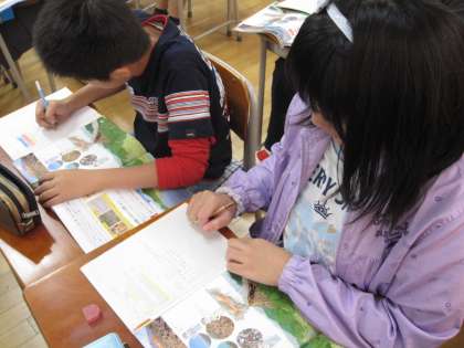「大地のつくりと変化」の学習をしています。いつも歩いている地面の下がどのようになっているのか,イメージするのが少し難しいようです。「れきって何ですか?」聞きなれない言葉に子どもたちは反応します。子どもたちの疑問は板書します。「れき・砂・どろはつぶの大きさで名前が変わる」など子どもたちからでてきた言葉も板書し,つぶの大きさなど詳しいことは,資料をもとに一人ひとりが熱心に調べていました。