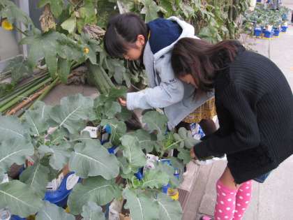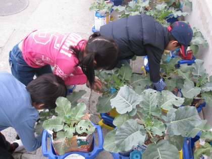2年生が種から育てた,ブロッコリーが大きな葉をつけています。水やりをしている子,雑草をぬいている子,葉につく幼虫を探している子…。どの子も自分が植えたブロッコリーが大きく成長するように大切に育てています。